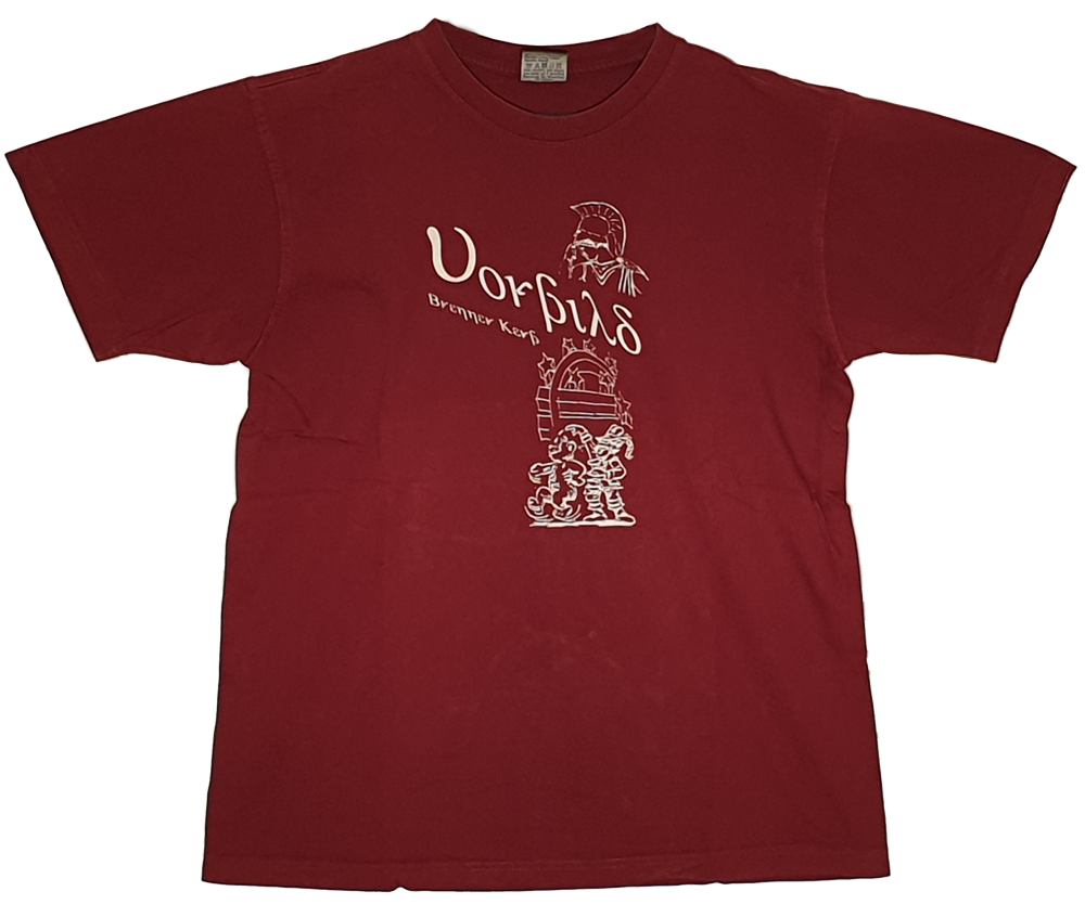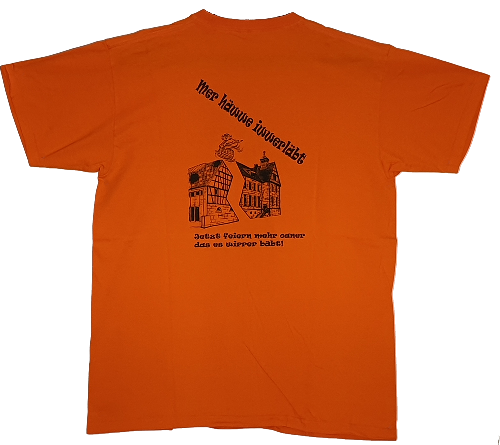 Jedes Jahr auf’s Neue wird ein T-Shirt mit eigenem Design und anderer Farbe entworfen. Wie ein roter Faden ziehen sich unsere Kerbfiguren durch die Historie der T-Shirts. Früher war das Kerb T-Shirt eher einfach gehalten und heute zeichnet es sich fast schon durch satirische Anspielungen auf politisches (Welt-)geschehen und aktuelle, teils auch lokale, Ereignisse aus. 2018 hat man dann ein eigenes Vereinsshirt entworfen um den Zusammenhalt der „Kerbgemeinschaft“ noch mehr zu unterstreichen.